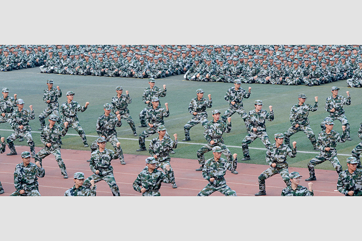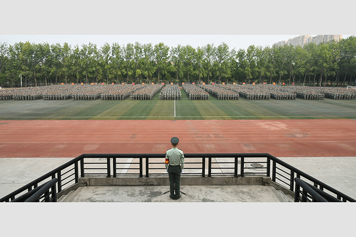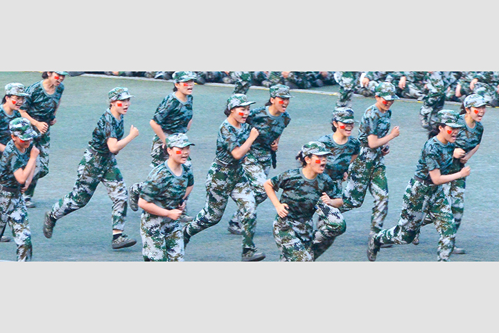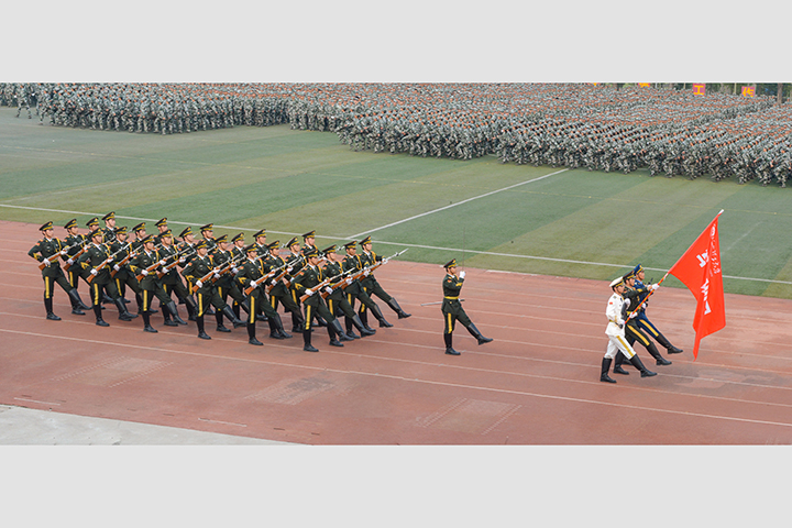 大会在雄壮的国歌声中拉开帷幕。邹友峰郑重宣布军训汇演正式开始。