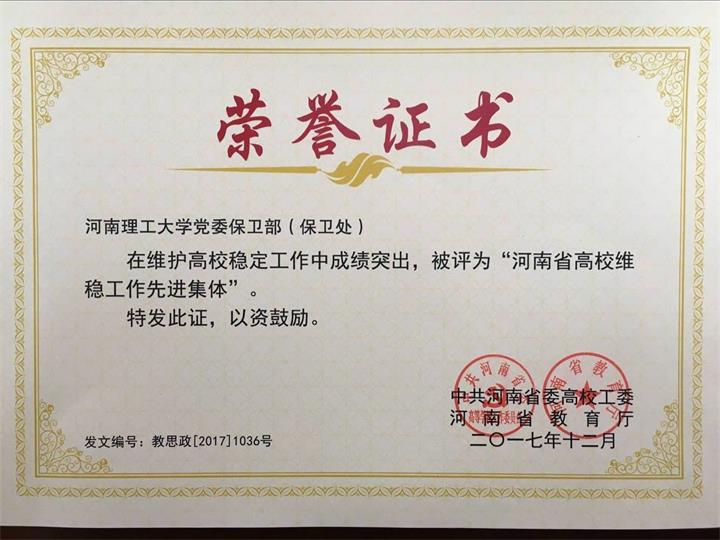 这是继学校获得“河南省2016年度高校维稳安保工作先进单位”后学校维稳工作获得又一荣誉。