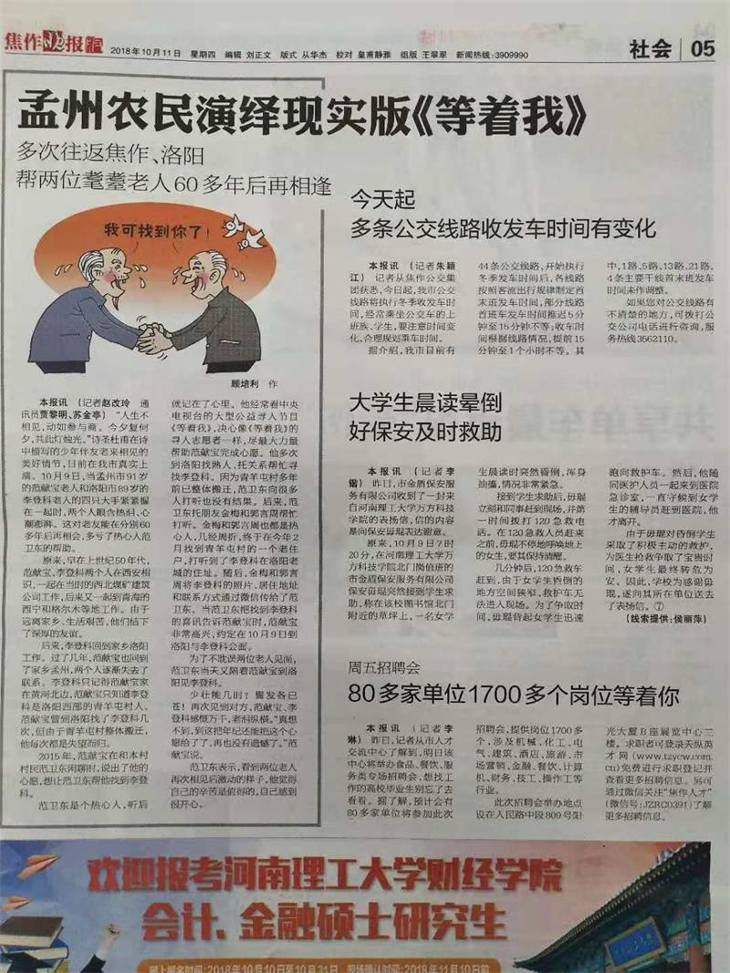 10月11日,焦作晚报第五版社会栏目以《大学生晨读晕倒好保安及时救助》为题报道了我校北校区保安队长毋琨同志积极救助突发急病昏倒学生的感人事迹。