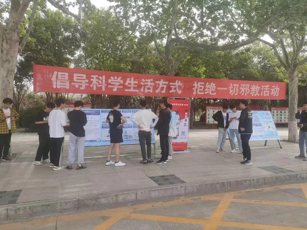 2023年4月13日开始在校内明德楼广场开展了国家安全教育日宣传教育活动和“反邪教警示教育进校园”活动。通过张贴摆放国家安全日和反邪教宣传条幅、海报、展板在校内展示,营造宣传舆论氛围。通过海报公布中国反邪教网,中国反邪教微信公众号,引导在校师生关注“中国反邪教”微信公众号,积极参与“对邪教说不”签名活动,提高了师生防范邪教意识和能力,强化了师生国家安全责任意识感。