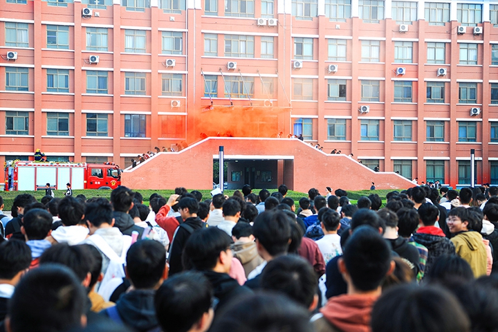 随后,同学们在工作人员的指导下,分别在一号教学楼、一号实验楼、第一图书馆前进行灭火救援实战演练。