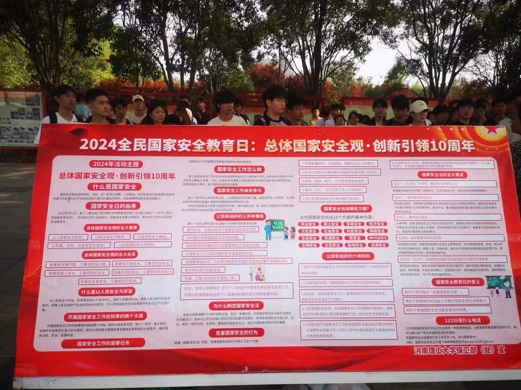 今年国家安全教育日活动主题是 “总体国家安全观,创新引领十周年”。活动通过摆放国家安全教育展板、发放安全教育宣传页、现场讲解国家安全、校园安全知识等方式向全校师生进行全方位安全知识宣传。政保科工作人员现场为同学们讲解了维护国家安全的重要性,并要求学生先自学再宣传,以实际行动影响并带动他人人人懂安全,人人维护安全。活动强化了师生保护国家安全的意识,让全体师生了解到国家安全的基本知识、履行维护国家安全的公民义务,并努力争当国家安全的守护者、宣传员。