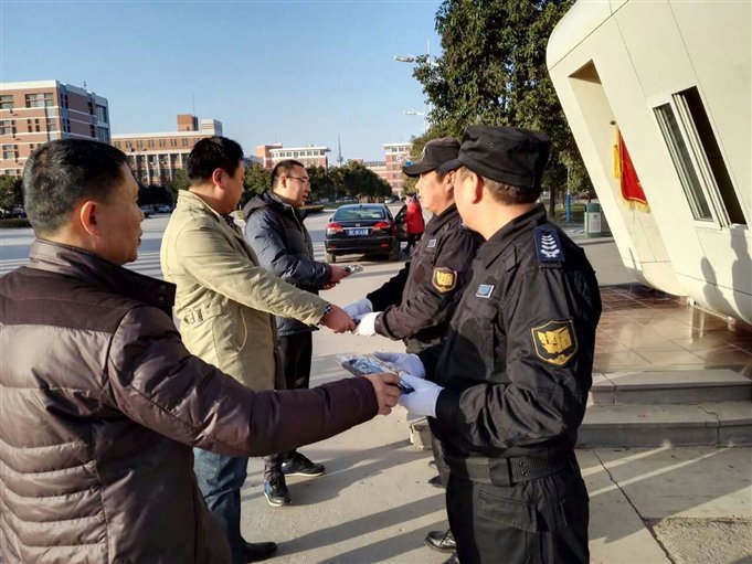 12月2日,保卫处党支部部分支委看望和慰问了坚守在一线岗位的校卫队队员和门岗保安队员,给一线队员们送温暖,为他们发放了御寒皮手套。