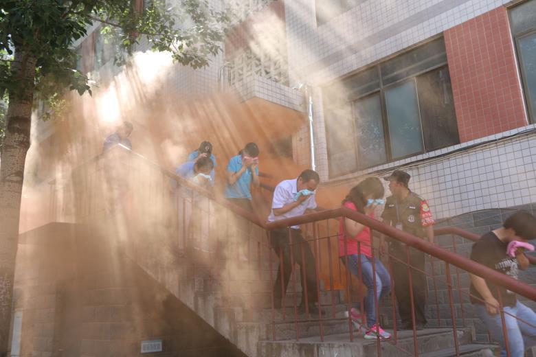 然后在5#公寓楼开展了消防应急疏散演练,随着一声哨声,演练开始。只见一股橙黄色的烟雾突然从公寓楼内冒出,迅速向四周蔓延。“火情”发生后,保卫科人员反应迅速,有序组织参演教工用湿毛巾捂住口鼻,弯腰低姿、迅速安全地紧急疏散到安全场所。在确认全部员工安全撤出后,保卫科工作人员最后离开现场,消防疏散演练活动顺利结束。