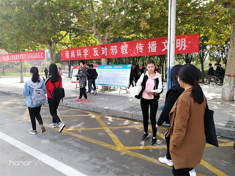 2017年10月15日至21日,为深入贯彻习近平总书记系列重要讲话精神,落实好上级反邪教斗争的方针、政策及相关精神,维护好学校安全稳定工作大局,我校在南北校区积极开展了“反邪教宣传周”活动。本次活动以“崇尚科学,反对邪教,传播文明”为主题,旨在向广大师生普及反邪教知识,弘扬科学精神,增强广大师生员工识别和抵御邪教侵蚀渗透的能力。